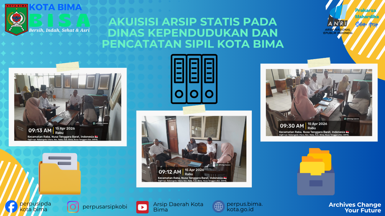 Kegiatan akuisisi ini dilakukan oleh Tim Akuisisi Arsip Statis DPAD Kota Bima dengan melibatkan pihak Disdukcapil Kota Bima dalam proses identifikasi, pemilahan, dan pendataan arsip.